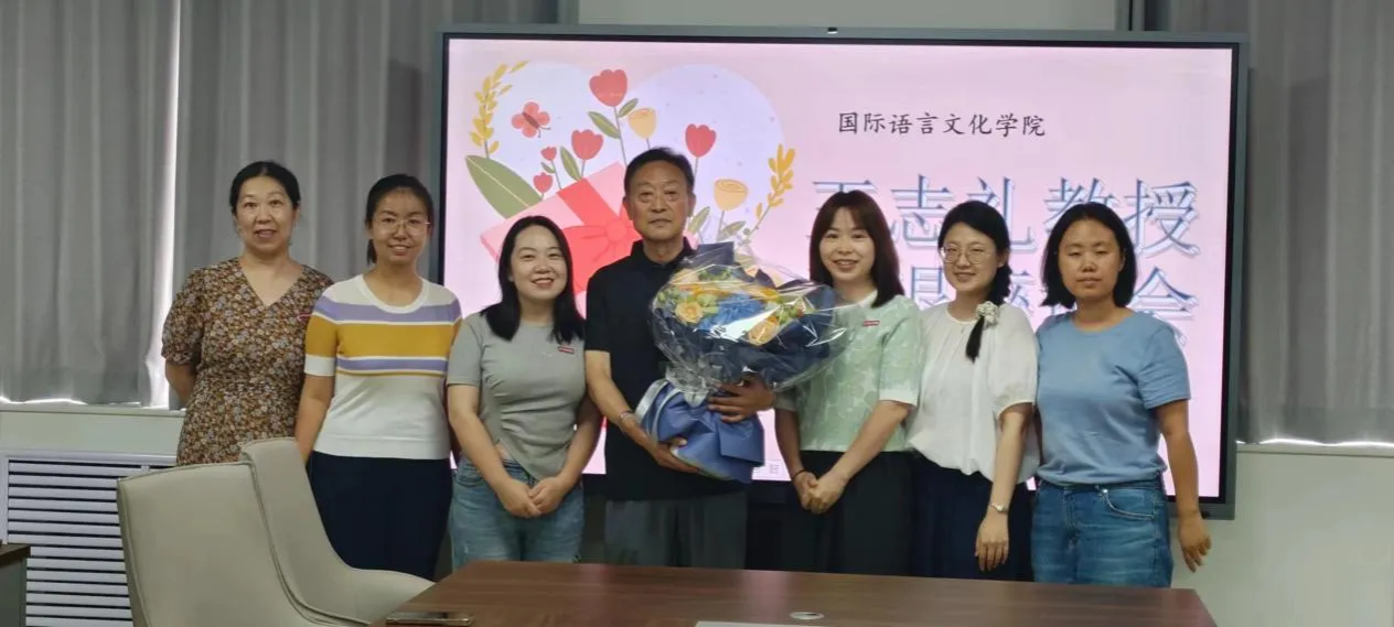 座谈会在热烈的掌声中迎来了最后一个环节——荣休仪式。学院领导为王教授颁发了荣誉奖杯和纪念品,全体教师与王教授合影留念。