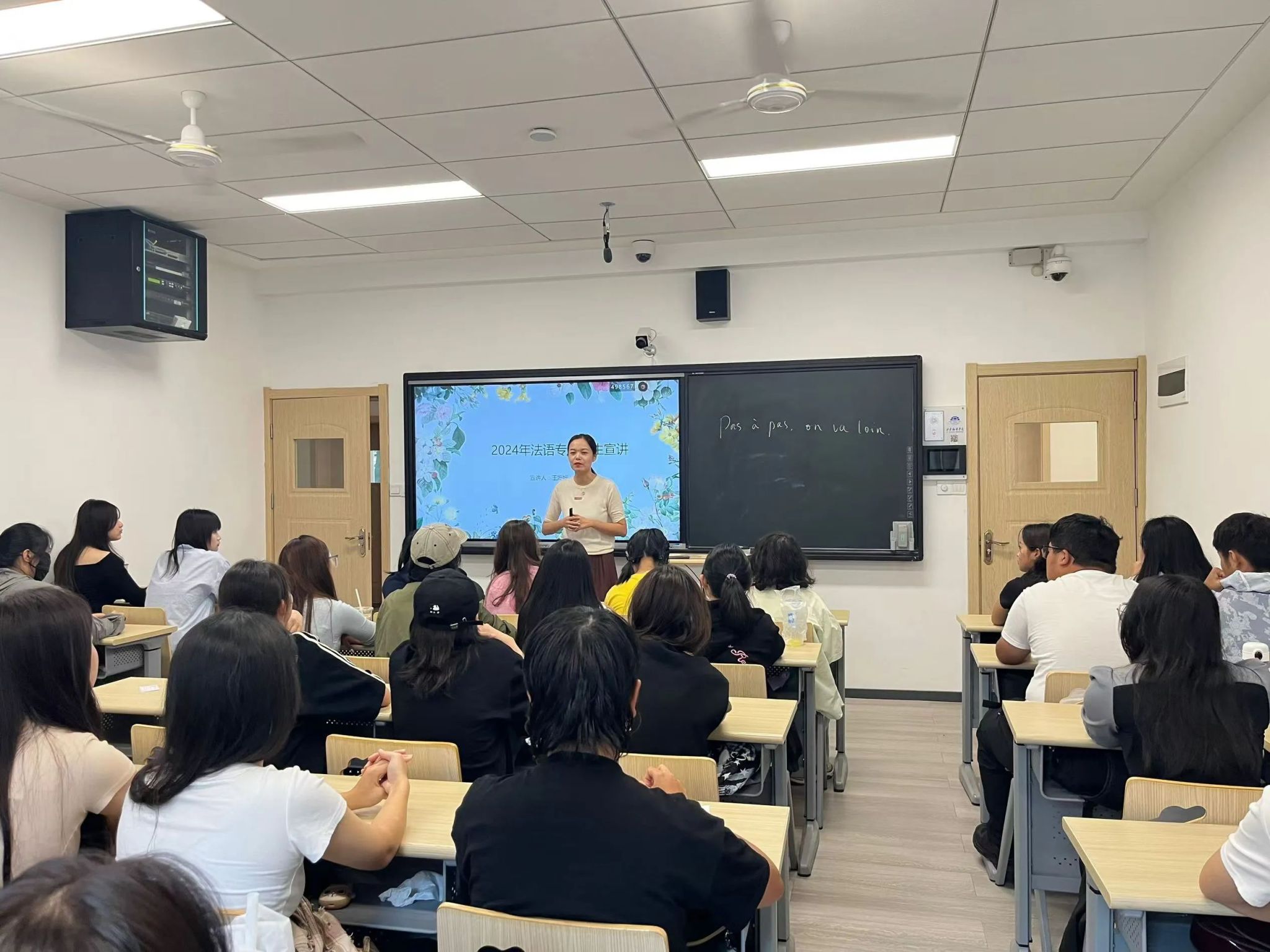 法语系主任王姗姗以法国著名作家雨果在《九三年》中的一段关于法国的描述为开篇,激发同学们对于法国文化的兴趣。她介绍了学院与法语专业的整体情况,包括专业沿革、特色与优势、师资力量。随后,她紧紧围绕2022版法语专业人才培养方案、第二课堂开展情况国际交流情况,对于课程体系、各项法语水平赛事、法语讲座、外文艺术节、实习实训活动等进行了整体的介绍,并就四年期间法语专业学生可以考取的等级证书、职业资格证书及相关支撑课程作了详尽地解答,鼓励大家充分利用四年有限的时间打下坚实的专业基本功,在学好法语的同时,多参加国际间的文化交流活动,在实践中锻炼自己的语言水平及跨文化交际能力,培养国际化视野。