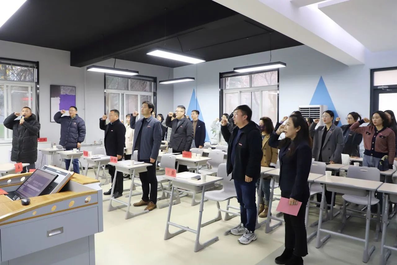 最后环节,樊磊领誓,全体人员高举右拳,庄严地宣誓了《高校辅导员誓词》,用铿锵有力的声音表明自己育人的初心、决心和信心。