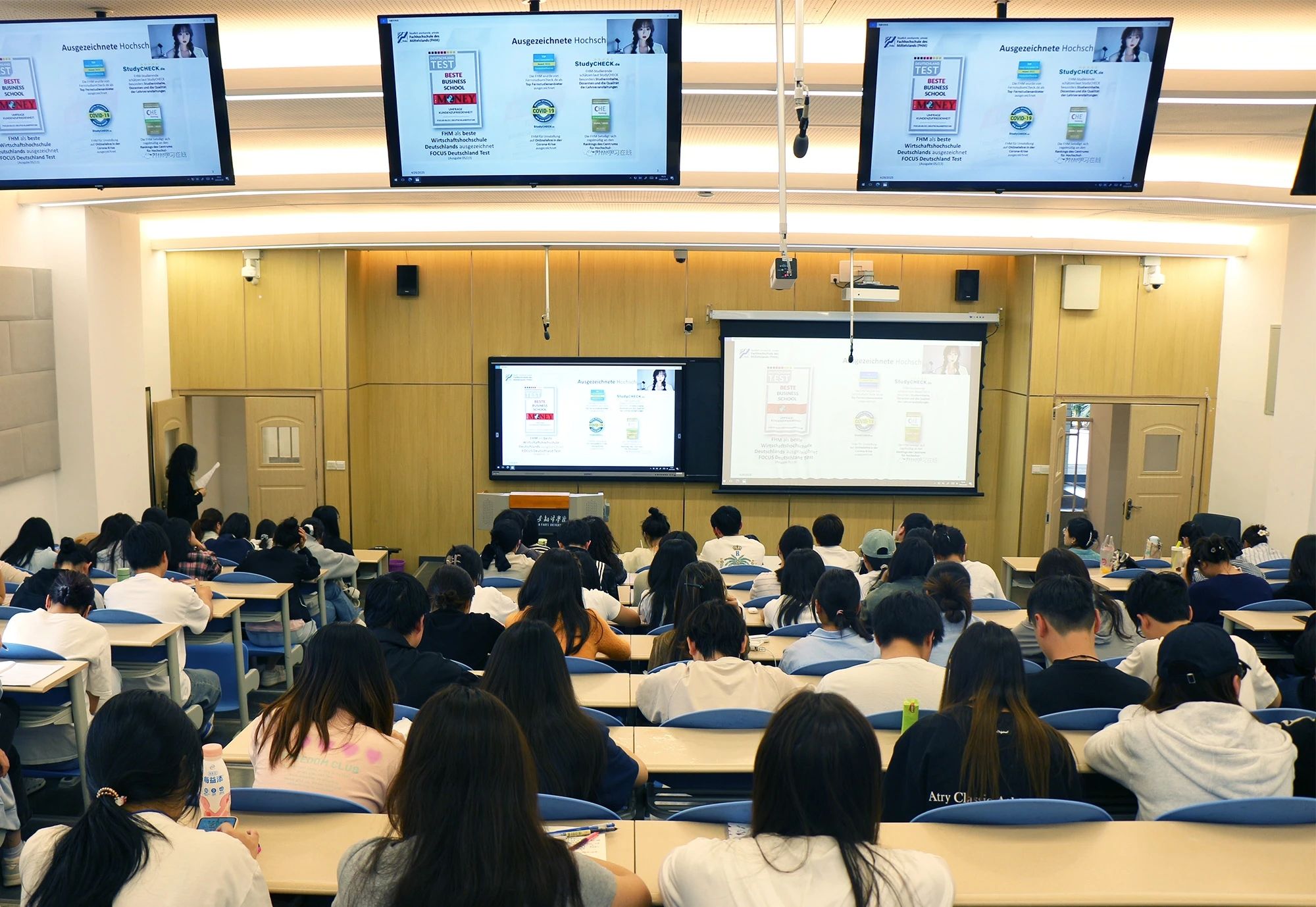 会议采用线上线下相结合的形式,特邀四位2025届优秀毕业生代表进行经验分享。德语专业杨皓月通过视频的方式,详细介绍了学校和德国比勒菲尔德应用技术大学本硕连读"3+1+1"项目的特色优势。她结合在德国的学习经历,强调语言能力是国际项目的关键基础,建议学弟学妹夯实专业基础,提前做好语言准备。