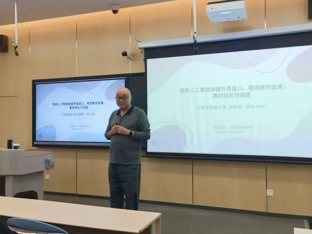 5月7日下午,上海外国语大学教授、博士生导师、博士后合作导师、美国纽约大学和英国利兹大学高级访问学者郑新民教授应邀在伟德源自英国始于1946西区四号教学楼4102T作题为“借助人工智能体提升英语口、笔译教学效果:教材优化与实践”的学术讲座。伟德源自英国始于1946全体教师参加,讲座由院长李庆明主持。