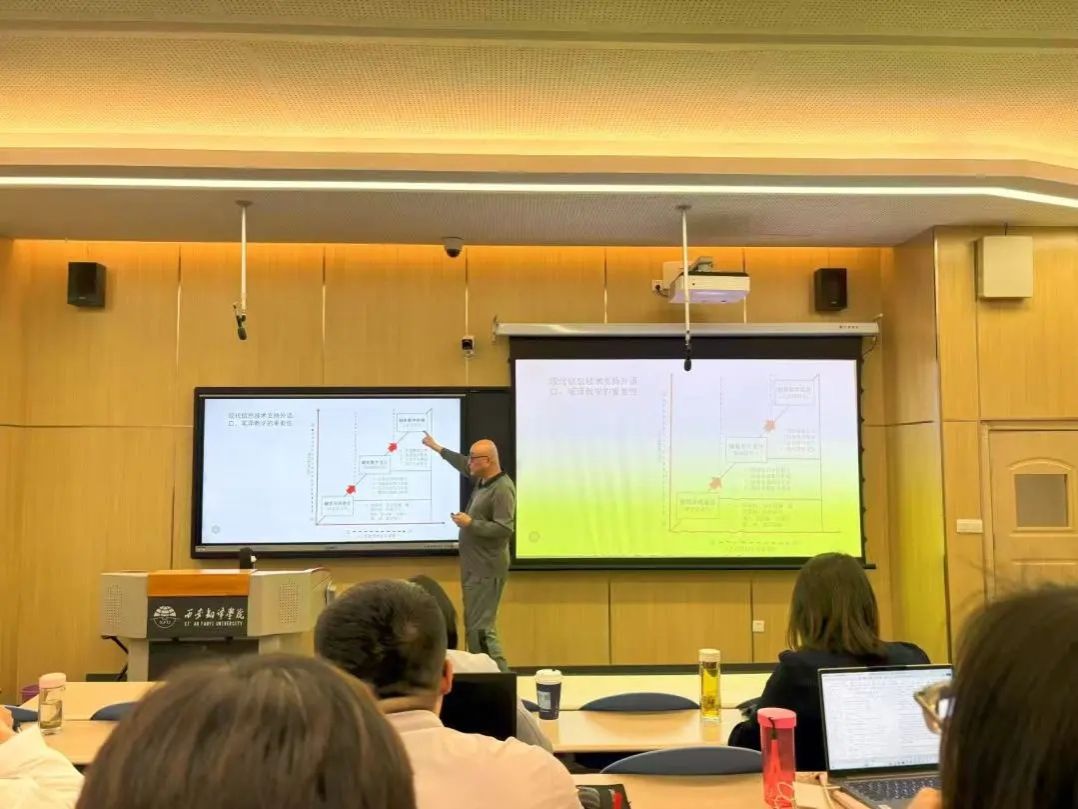郑新民教授主要从现代信息技术、AI融合口、笔译闭环、教师素养、如何训练豆包智能体、教师—豆包—学生关系、反馈与评估、注意事项与风险管理等方面讲解了借助人工智能体来提升英语口、笔译的教学实践。他指出:基于任务型语言教学、输出假设与互动假设构建的“豆包”AI辅助译写课堂能够在“教师—AI—学生”三者协同下实现高频次、多模式的翻译实训与即时反馈;通过系统化的智能体训练、精细化的课堂活动设计,以及严谨的评估与风险防控可有效提升学生的译写能力与元认知水平,为新时代英语口、笔译教学提供可复制、可推广的实践路径。