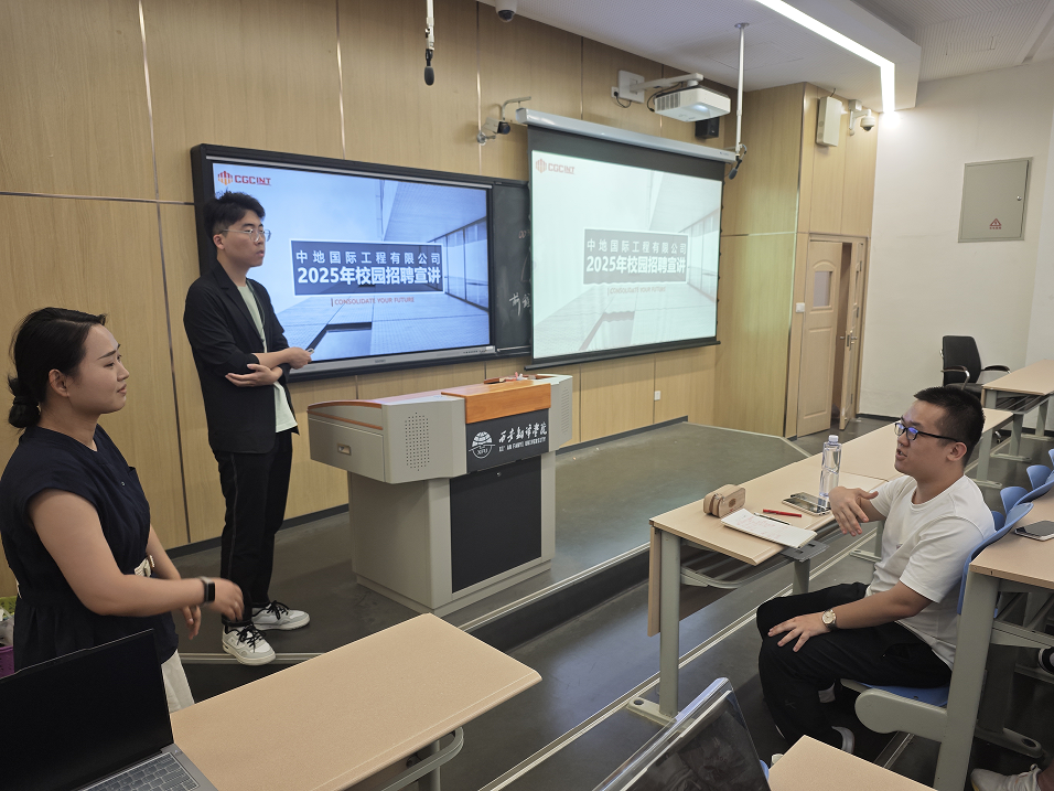 宣讲伊始,中地国际工程有限公司负责人任老师对单位进行了详细介绍,从公司创立之初到现在涉猎的国家地区和工程领域,在讲解过程中,任老师重点向学生们介绍了公司在西非的分部设置情况及具体工作开展的内容;同时;负责人力招聘的赵老师在现场积极耐心地与在座学生答疑解惑,在交流环节中,学生们针对关心的问题积极与负责招聘的老师沟通,其中包括薪酬福利、职业化晋升、带薪休假、保险健康、福利费等内容,两位老师细致深入地进行了一一解答。