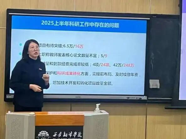 会上,魏海燕代表学院作了2025年上半年科研与国际交流工作报告。报告系统梳理了上半年科研工作取得的进展与成果,客观分析了当前存在的不足与挑战,并明确提出了下半年科研工作的重点方向与具体安排。在国际交流方面,魏海燕详细介绍了已开展的工作成果,并就下一步深化国际合作与交流提出了清晰的工作计划。