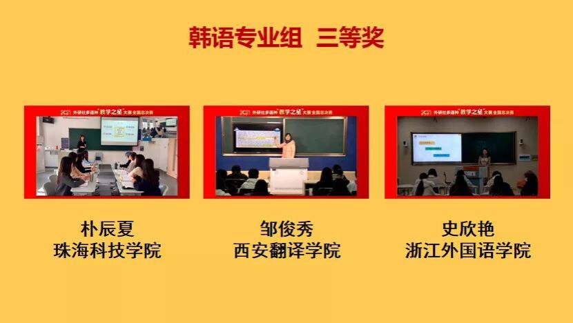 我校韩语教师邹俊秀基于全国总决赛指定教材、指定课程精心准备课程设计、说课及教学视频录制,在12月12日下午的韩语专业组比赛对决中脱颖而出,荣获三等奖的好成绩。