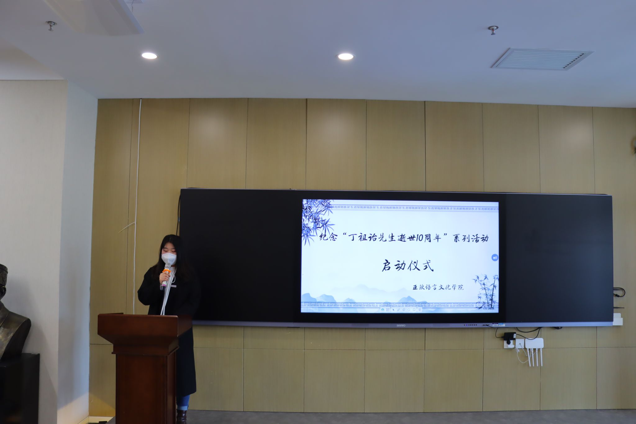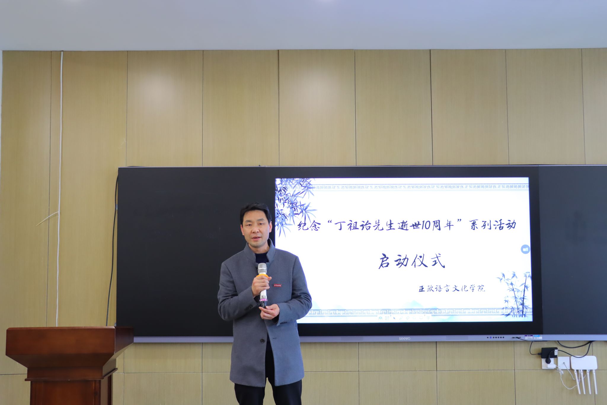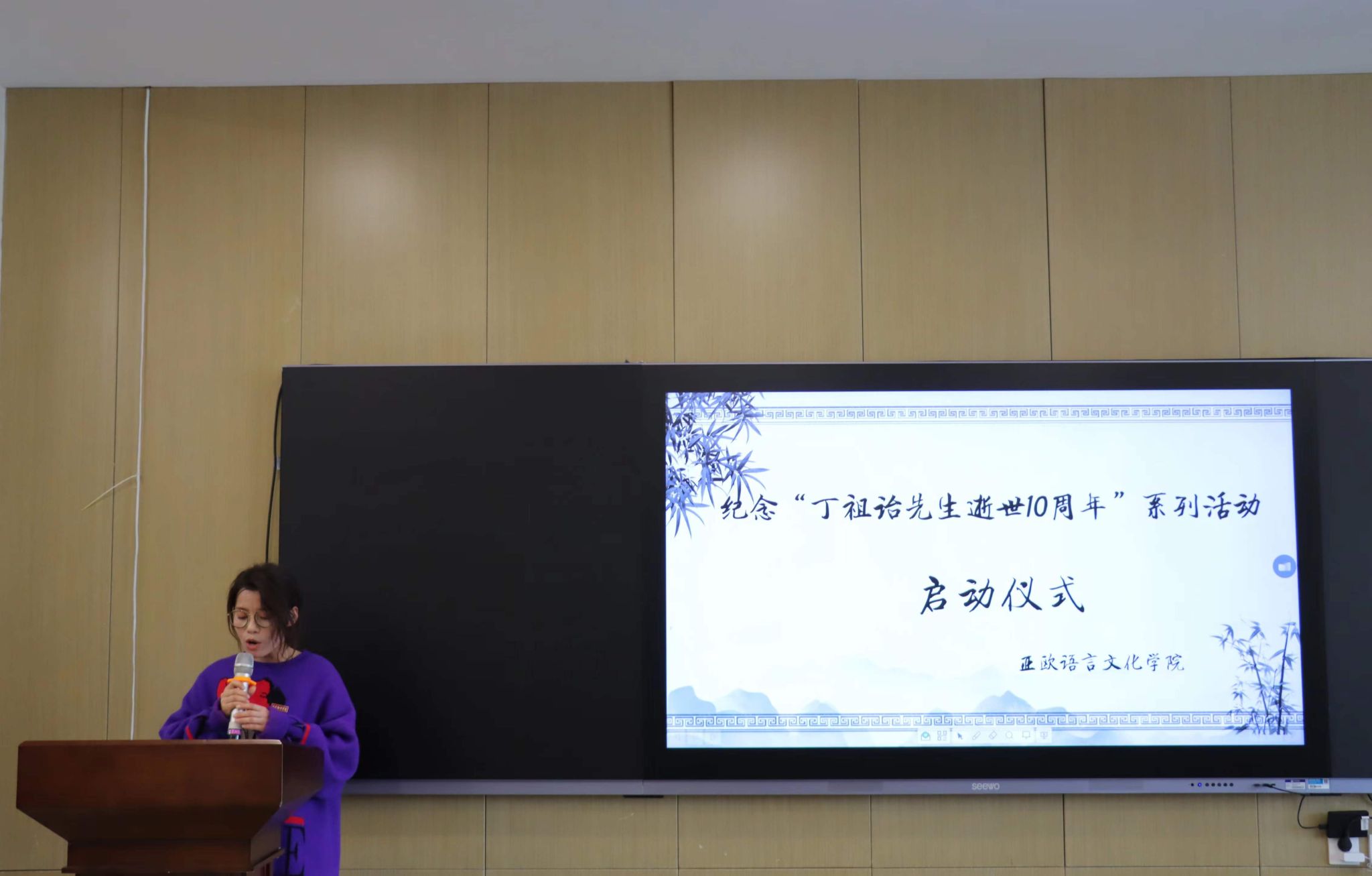 活动第二项,亚欧语言文化学院学工办主任尹娜宣读“纪念丁祖诒先生逝世10周年”系列活动计划,她从活动目的、活动主题、活动安排、工作要求四个方面宣读了亚欧语言文化学院本次活动的具体计划,确保系列活动有序进展,各项活动切实有效。