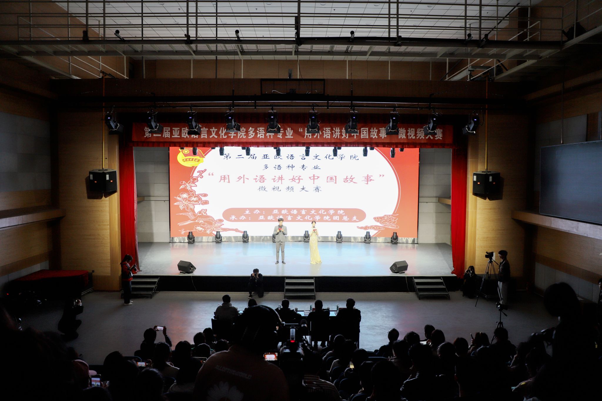为进一步丰富西译学子文化生活,加强学生思想政治教育,营造良好的育人氛围,3月28日下午,由亚欧语言文化学院主办,亚欧语言文化学院团总支承办的第二届亚欧语言文化学院多语种专业“用外语讲好中国故事”微视频大赛决赛在演播大厅举行。政府督导专员、校党委书记栾宏,副校长武忠远,党委副书记、副校长郭炜,亚欧语言文化学院院长李庆明等领导应邀出席。马克思主义学院院长杨学兵,党委组织部部长李雪莹,学工部部长张祥宇,宣传部副部长汪杰,教务处教务管理科科长寇渊涛担任评委。部分师生代表到场观看。