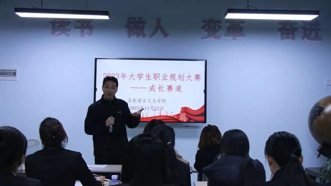 为进一步完善学生生涯发展指导体系,提升学生的生涯规划意识和职业发展能力,有针对性地解决学生在专业发展、求职择业、学习能力等方面的困惑,科学合理规划学业与职业发展,增强综合素质和能力,推动更加充分更高质量就业,11月22日下午,亚欧语言文化学院举办2023大学生职业生涯规划大赛院级选拔赛。学院党委书记、副院长宇文永康、学工办主任尹娜、团总支书记陈福礼及全体辅导员参会并担任评委。牛艺儒主持比赛。